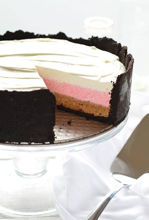 I just love how this looks… with the deep dark chocolate crust and then chocolate cheesecake, then strawberry cheesecake, then the sweet vanilla cheesecake. It’s a Neapolitan and Cheesecake lovers dream!